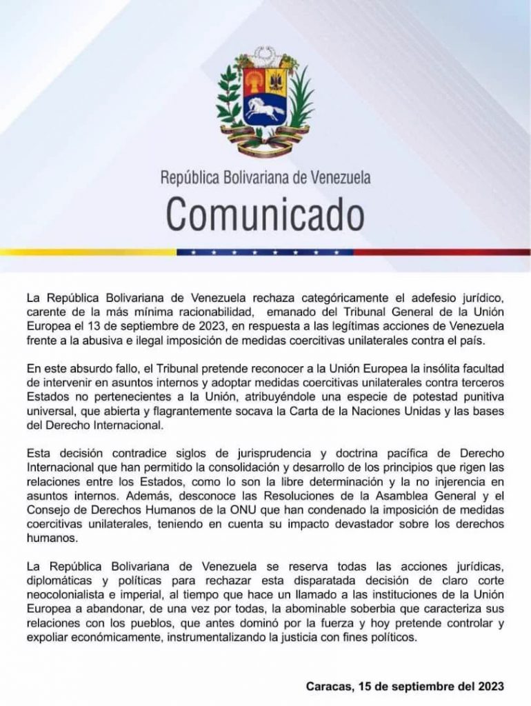 La República Bolivariana de Venezuela rechaza categóricamente el adefesio jurídico, carente de la más mínima racionabilidad, emanado del Tribunal General de la Unión Europea el 13 de septiembre de 2023, en respuesta a las legítimas acciones de Venezuela frente a la abusiva e ilegal imposición de medidas coercitivas unilaterales contra el país.